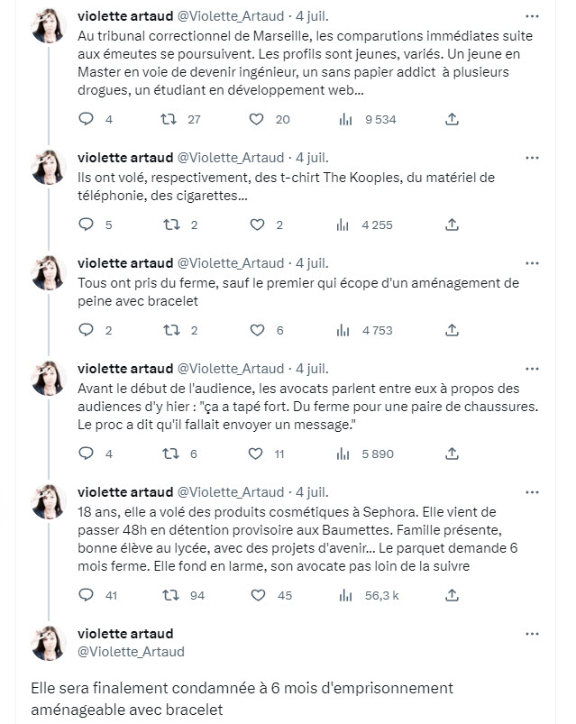Dans le contexte de récentes émeutes en France, le tribunal correctionnel de Marseille a été particulièrement actif. Un éventail de profils allant de l'étudiant en ingénierie aux dépendants en substances, tous ayant dérobé des articles divers et variés, ont défilé devant le juge. Les sentences ont été, pour la plupart, fermes, seules quelques exceptions comme l'ingénieur en herbe ont eu des peines aménagées. Dans ce carrousel judiciaire, une lycéenne de 18 ans a particulièrement retenu l'attention, emprisonnée pour le vol de cosmétiques. Elle a écopé de 6 mois avec bracelet. Une sévérité étonnante ? Dites-le-nous en commentaire !