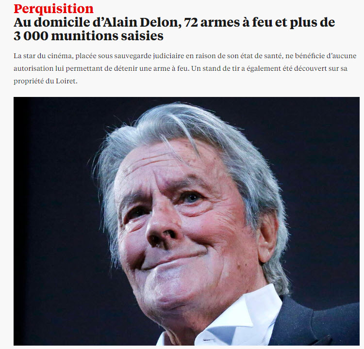 Lors d'une perquisition chez l'acteur Alain Delon, 88 ans et en mauvaise santé, la justice a découvert 72 armes à feu et plus de 3 000 munitions sans les autorisations nécessaires. Cette intervention fait suite à un signalement du mandataire chargé de la protection judiciaire de l'acteur, suite à des différends avec sa famille au sujet de son héritage.