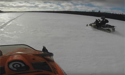 Lancé à plus de 140 km/h sur sa motoneige sur un lac gelé, ce pilote va venir chuter lourdement après avoir glisser sur un "nid de poules". Forcément, il s'agit d'une sorte de petite crevasse où le patin droit (vu de fac...