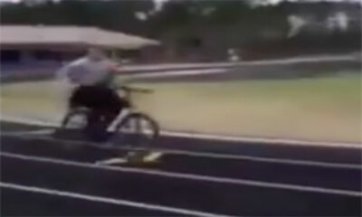 A travers cette vidéo, on peut voir un jeune provoquer volontairement la chute d'une femme qui se trouve sur son vélo. Ce merdeux avec son ballon attend que l'agent de police arrive à sa hauteur pour ensuite jeter son ba...