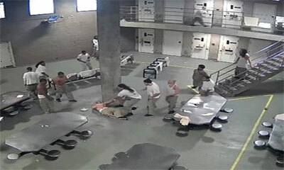 A la prison de Cook County, une bagarre a éclaté entre deux bandes rivales où l'un des prisonniers a été assommé et roué de coups. sur ces images tournées par une caméra de sécurité, on peut voir la violence de cette agr...