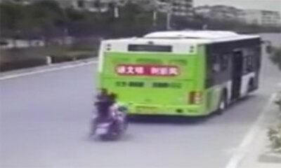 En Asie, une caméra de sécurité filme un accident assez rare montrant un scooter transportant 3 passagers plus le pilote venir s'encastrer dans l'arrière d'un bus. Pourquoi le pilote ne s'est pas arrêté ? Cela reste un m...