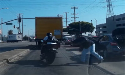 A Los Angeles aux États-Unis, un homme au volant de sa voiture filme une altercation entre un motard et un automobiliste. Sur la vidéo, nous pouvons voir le motard s'approcher à pied d'un voiture pour discuter avec le co...
