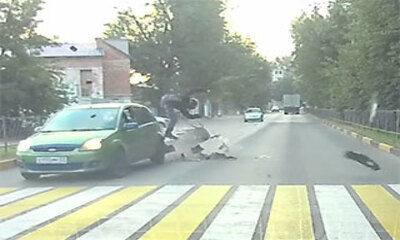 Le 27 août 2016, à Kertch en Crimée, la caméra embarquée d'une voiture a filmé un accident assez bête qui a impliqué un motard, une voiture et une mémé. Alors que les voitures s’arrêtent à un passage piéton afin de laiss...
