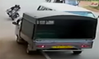 Un motard qui roule sur une route en Thaïlande veut doubler un véhicule par la gauche et au même moment arrive une camionnette en sens inverse qui le percute. Mais le motard va être heurté au niveau de la tête et être éj...