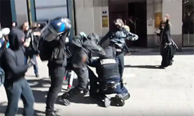Durant les violentes manifestations à Nantes début mai 2016, un CRS a été tabassé par des manifestants. La scène se passe dans la rue de la Marne où le Commandant des CRS se retrouve seul face à des manifestants et essai...