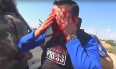 Un journaliste de la chaîne Orient News, faisait un reportage, en direct à la télévision à Handarat, près de la ville d'Alep, en Syrie lorsqu'une puissante explosion s'est produite près de lui. Un obus est tombé non loin...