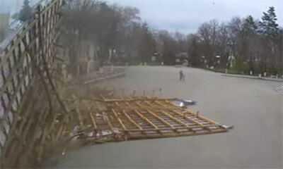 Des images incroyables provenant de Russie qui nous montre un toit d'immeuble se faire arracher par les violentes bourrasques de vents et venir tomber sur des piétons. Mais par miracle, ces derniers esquiveront de justes...