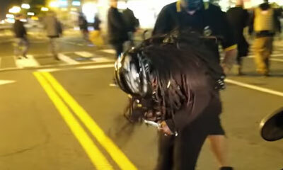 A Washington DC, une BLM et Antifa brandit un couteau face à des Proud Boys et crie : Ne la touchez pas. Je vais vous tuer ! Alors que d’autres BLM tentent de la raisonner, un homme qui appartient au Proud Boys, s’appro...