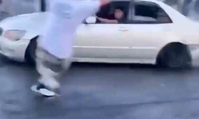Lors d'un rassemblement de Drift à Los Angeles aux États-Unis, un participant armé d'un Uzi décide de s'approcher trop près des véhicules qui font des drifts au milieu de la rue. Et l'un d'entre eux qui est armé d'un pis...