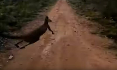 Un motard vient percuter un kangourou. Alors qu’il circule sur un chemin ou route assez isolée dans la verdure Australienne, un kangourou surgit précipitamment et vient heurter le motard. Le biker va alors préférer conti...