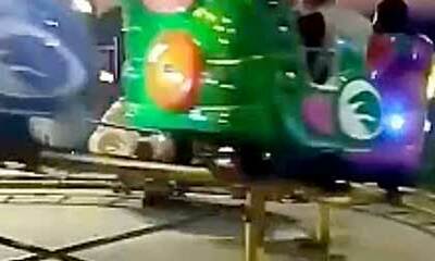 Dans un parc d’attractions en Chine, une mère et son enfant font du manège lorsque le wagon déraille et tombe au sol. Heureusement, il s’agit d’une attraction pour enfants et la mère et son petit ne tombera pas de très h...