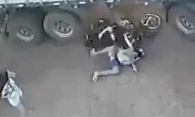 Au Brésil, un chauffeur de camion semble ne pas aimer les deux-roues et vient frôler un motard et un cycliste. Pire, il ne frôle pas, il vient carrément toucher les deux qui vont chuter et manquer de passer sous les roue...