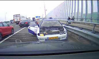 Aux Pays-Bas sur l’autoroute A73, un conducteur au volant d’un Honda Civic tuné façon Jacky Tuning pense avoir un bolide qui tient la route. On peut voir doubler de force un véhicule qui s’insère puis perdre le contrôle ...