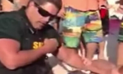 Lors du Spring Break sur la plage de la ville St. Pete Beach (Saint Petersburg Beach) en Floride, un homme a filmé l’intervention d’un policier qui tente de maîtriser un jeune homme sur la plage. Pour cela, il le place f...