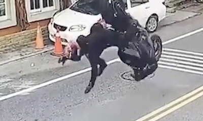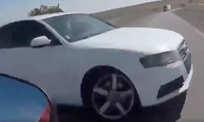 Sur cette vidéo filmée sur la célèbre route 66 aux États-Unis, un motard vient se faire percuter par une femme au volant. Comme le montre les images de la caméra embarquée fixée sur le casque du motard, on peut la voitur...