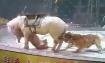 En Chine, un cheval a été attaqué par un tigre et une lionne. Sur ces images, on peut voir le cheval essayer tant bien que mal de rester debout en courant le long de piste, tandis que les dresseurs utilisent leur fouet p...