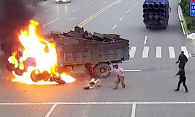 À Nanchang, en Chine, une caméra de surveillance a capturé un accident entre une moto et un camion benne. Sur ces images, on peut voir un motard venir s’encastrer dans le réservoir d’un poids-lourd avant de prendre feu. ...