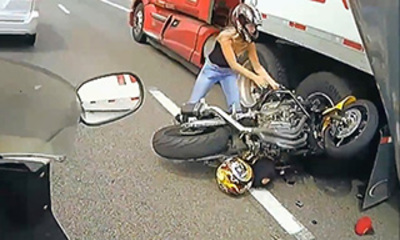 Lors d’un rassemblement de motard aux États-Unis, un des pilotes qui tente de se faufiler un passage entre deux véhicules se crashe. On peut voir sur ces images, le motard tenter de passer entre une voiture et un camion ...