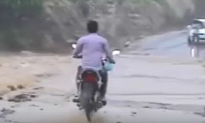 Des images dramatique d'un homme imprudent qui avec sa moto veut traverser une rivière inondée avec un fort courant au Pérou. Arrivé au milieu de la rivière, le motocycliste commence par se faire emporter par une vague e...