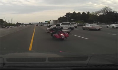 En Californie aux États-Unis sur la côte Ouest en Amérique du nord, une voiture change de file mais ne voit (ou ne ne regarde) pas un motard arriver sur le côté. Alors qu'il roule sur la file de gauche, le motard vient s...