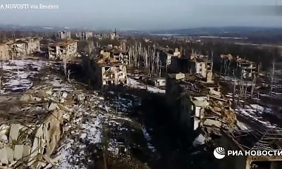 Des images filmées par un drone montrent la destruction causée par les féroces combats entre l'Ukraine et la Russie à Bakhmut. Les combats ont duré des mois et ont réduit la population de la ville de 70 000 à seulement 5...
