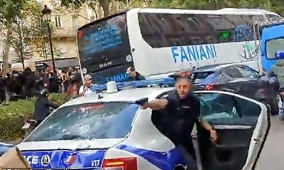 Un policier parisien a été filmé menaçant des manifestants avec son arme lors d'une manifestation contre la violence policière. Les manifestants ont poursuivi une voiture de police, la ciblant avec divers projectiles, av...