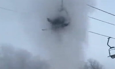 Dans une station de ski, Un télésiège est bloqué juste au dessus d'une canalisation. Mais abîmée, la canalisation crache des mètres cube d'eau sous pression au moment ou un skieur passe et se retrouve bloqué à cause du p...