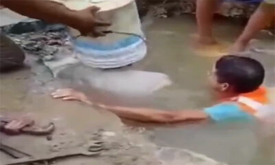 Dans cette vidéo insolite, des hommes doivent travailler sous l’eau. Mais n'ayant pas de matériel, il utilise un seau maintenu sur leur tête par un collègue. Ce seau permet d'avoir une réserve d'oxygène durant quelques i...