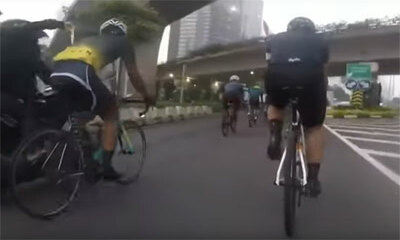 Sur une route à Jakarta, en Indonésie, un cycliste se fait voler son téléphone portable ou GSM par deux hommes à scooter. Ces derniers saisissent l'appareil à l'intérieur d'une poche située dans le maillot au dos du spor...
