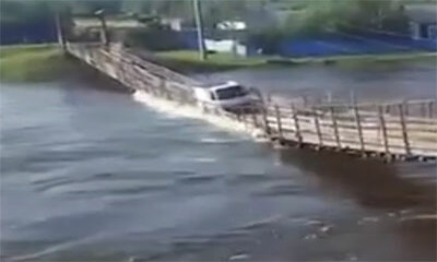 A Uryum en Russie, une camionnette a voulu emprunter un pont suspendu en bois, qui a été construit pour remplacer provisoirement un pont en béton détruit par une précédente inondation. Destiné aux piétons, le pont n'a pa...