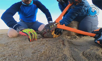 Les images d’un sauvetage provenant de l'équipe de l'ONG Ocean Conservation Namibia (OCN) qui retire un hameçon coincé dans la langue d'une otarie à fourrure. Ces images ont été filmées sur une plage en Namibie ou les me...