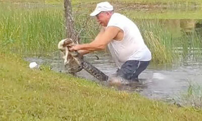 Âgé de 74 ans, Richard Wilbanks appelé aussi Cocrodile Dundee se promène avec son chiot Gunner, un épagneul de 3 mois, vers le lac Estero, situé en Floride. Alors que le chien s’approche de l’eau, un alligator surgit bru...