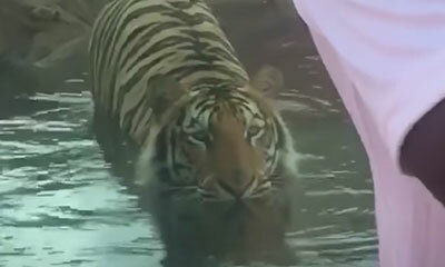 Dans un zoo en Louisiane, aux États-Unis, des amis se sont trouvés près de l’enclos des tigres. Et ils ont appris comment chassait les tigres grâce à un ami. Pour cela, ils se sont placés de dos derrière une vitre transp...