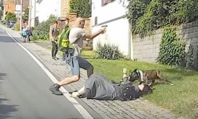 Un policier tire vers un chien pour le faire fuir. Le vendredi 17 juillet 2020 à Nebilovy, en République tchèque, Martin, un policier en civil de la ville Pilsen, se promène avec sa famille lorsqu'un chien de race Americ...
