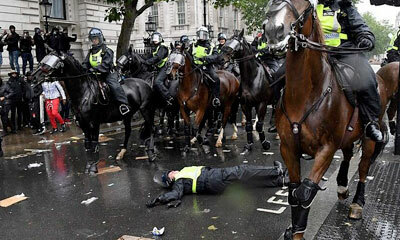 Samedi 6 juin 2020 à Londres, en Angleterre, une policière à cheval est venue heurter un poteau lors d'une manifestation contre le racisme et les violences policières. Le cheval qui recevait des projectiles est devenu in...