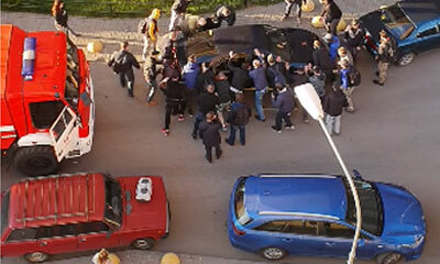 Le 23 mai 2020 à Saint-Pétersbourg en Russie, des passants ont poussé une voiture qui empêchait un camion de pompiers de passer. Sur cette vidéo, on peut voir plusieurs hommes tenter de soulever une voiture. Après plusie...