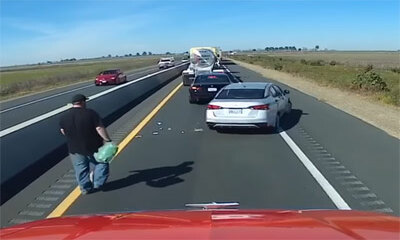 Durant un embouteillage à Rio Vista, en Californie, un conducteur qui remonte la file d’arrêt d’urgence se faufile devant le camion de Jason Gwilliam. Il commence alors par jeter toutes ses ordures à l’extérieur de son v...