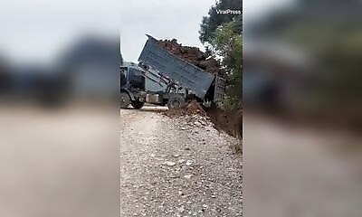 En Chine, un conducteur de camion benne a frôlé la catastrophe. Alors qu’il déversait de la terre dans un ravin à Pingbian, dans le Yunnan, le poids du chargement a fait basculer le camion. Le sol était humide, rendant l...
