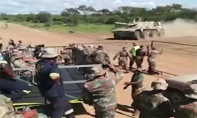 Lors d’une démonstration d’un Rooikat qui est un véhicule militaire sud-africain, des militaires se sont installés dans des gradins. Alors que le pilote du char doit freiner brusquement pour montrer la souplesse du véhic...