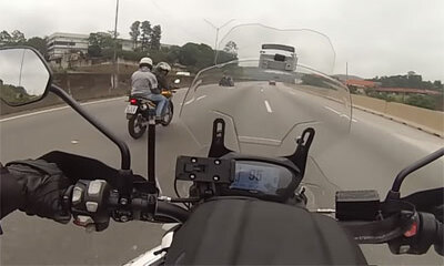 Fou ! Courageux ou débile ? Au Brésil, Eduardo Pimenta roulait au guidon d'une Triumph Tiger 800 sur une autoroute. Doublé par des voleurs à moto intéressés par sa machine, il prend la décision de faire demi-tour sur l’a...