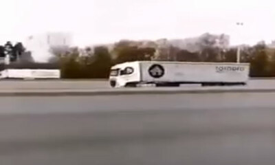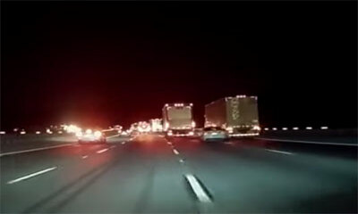 Un chauffard tente de passer entre deux camions. Un conducteur en mode Fast and Furious roule à vive allure sur une autoroute en Californie. Roulant sur la voie de droite, il ne peut se rabattre à temps sur la voie de ga...
