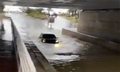 Traverser une route inondée à Cannes. Ce samedi 23 novembre 2019 de fortes pluies sont tombés dans le Var. A Cannes, le quartier de La Bocca, plusieurs routes ont été inondées. Malgré cela, un conducteur imprudent a pens...