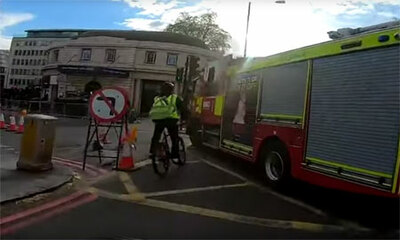 Tel l’aigle de la route, un cycliste qui est toujours dans ses droits d’après le règlement du cycliste veut absolument forcer le passage. En Angleterre, un cycliste se fait devancer par un camion de pompiers qui tourne s...