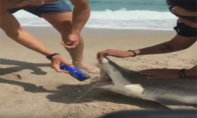 Lors du Spring Break aux Etats-Unis, une jeune homme complètement idiot a été filmé en train d'utiliser un requin échoué sur la plage comme décapsuleur. Pour cela, alors qu'un ami tient avec ses mains la gueule du requin...