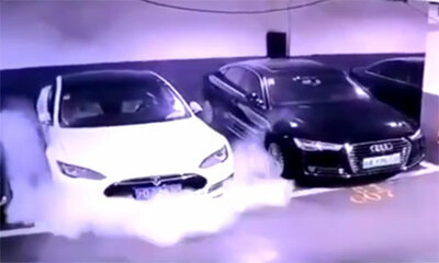 À la manière d'un téléphone portable comme l’Iphone ou le Galaxy Note, une voiture Tesla prend feu dans un parking souterrain. Ce dimanche 21 avril 2019 à Shanghai en Chine, voiture Tesla Model S a pris feu dans un parki...