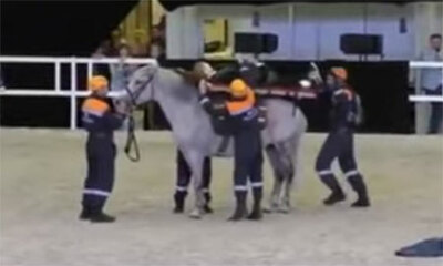 Lors d’une démonstration de secourisme équestre en Russie, des secouristes nous montrent comment transporter une victime sur une civière à l'aide d'un cheval. Mais forcément, la vidéo ne serait pas drôle sans la moindre ...