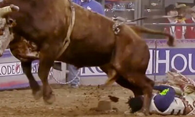 Avoir de la chance ? Voici un bel exemple avec ces images tournées en 2017 ou le cowboy américain Neil Holmes a manqué de se faire écraser la tête par un taureau lors du Houston Livestock Show and Rodeo. Après une chue a...