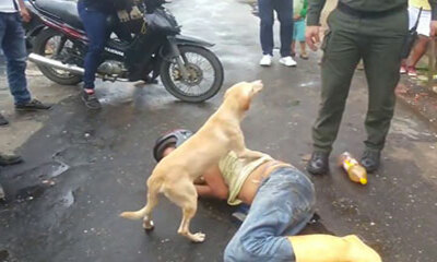 Un chien protège son maître ivre qui est allongé et endormi avec un casque de moto sur la tête au milieu de la rue d’un ville en Colombie. Lorsque des passants ou des policiers s'approchent de l'homme pour essayer de le ...