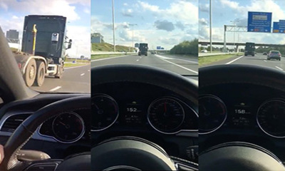 Quelle surprise pour ce conducteur au volant d’une grosse berline qui ne pensait pas se faire doubler par un camion sans sa remorque. On peut ainsi voir que le camion roule à plus de 150 Km/h et double tout ce qu’il pass...
